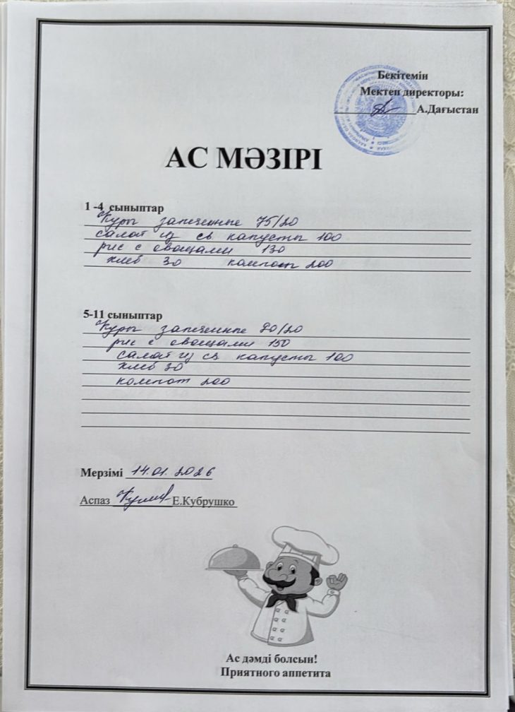 Күнделікті ас мәзірі 14.01.2026