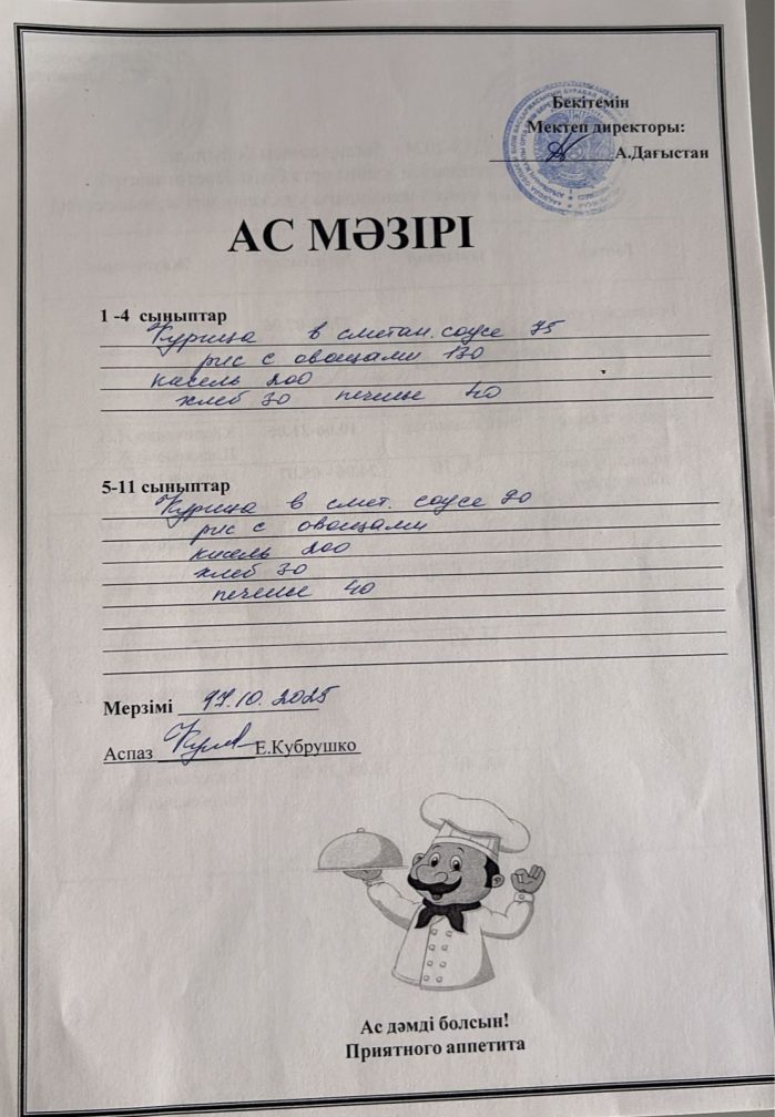 Күнделікті ас мәзірі 17.10.2025