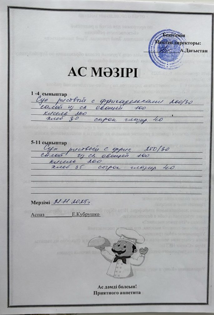 Күнделікті ас мәзірі 21.11.2025