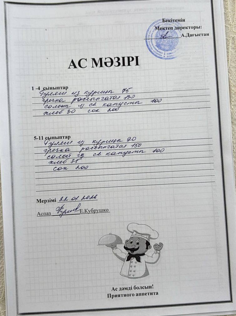 Күнделікті ас мәзірі 22.01.2026