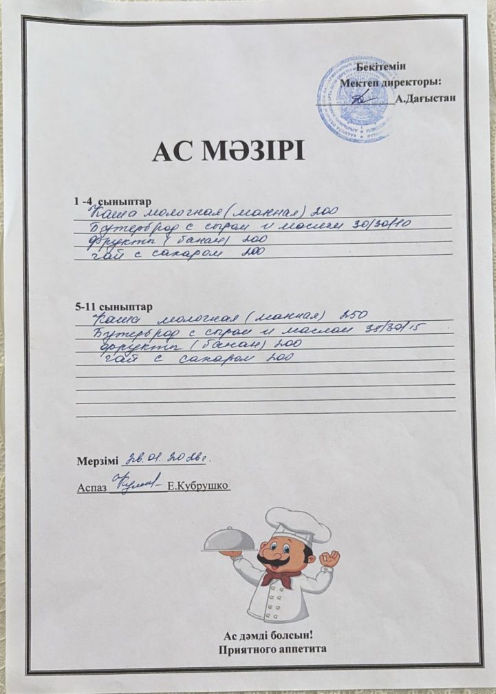 Күнделікті ас мәзірі 26.01.2026