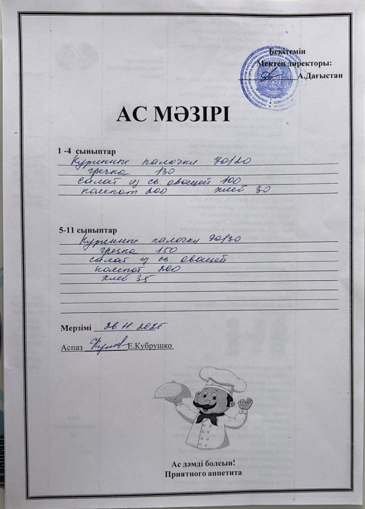 Күнделікті ас мәзірі 26.11.2025