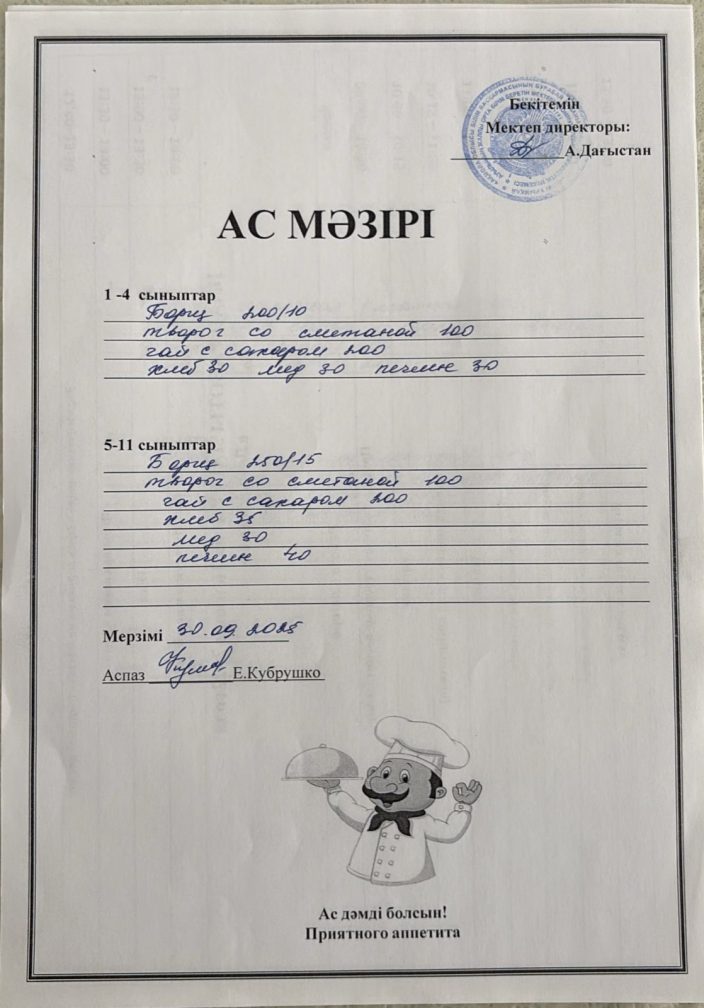 Күнделікті ас мәзірі 30.09.2025