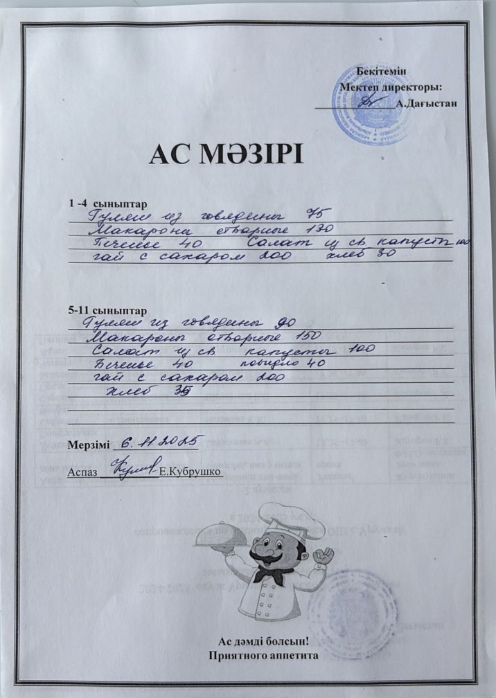 Күнделікті ас мәзірі 6.11.2025