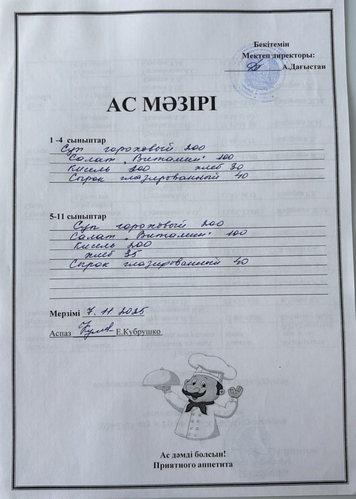 Күнделікті ас мәзірі 7.11.2025