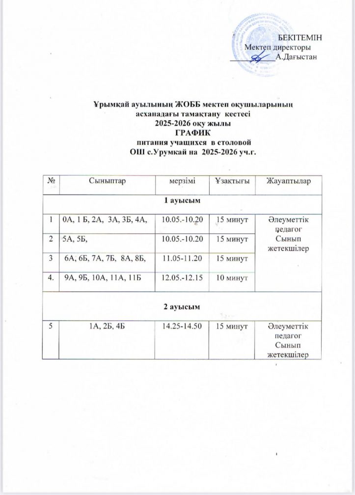 Ұрымқай ауылының ЖОББ мектеп оқушыларының асханадағы тамақтану кестесі 2025 -2026 оқу жылы