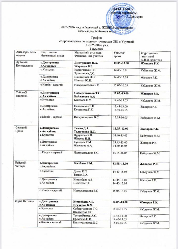 2025-2026 оқу жылында Ұрымқай ауылы ЖББМ тасымалдау бойынша сүйемелдеу кестесі